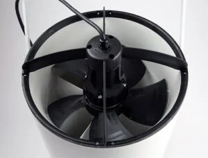 With any axial fan, there exists a radial component to the air flow causing it to spread laterally and lose velocity when leaving the nozzle. Airius’ patented fixed blade stator sits below the fan to transfer this rotational energy into linear motion exiting the nozzle.